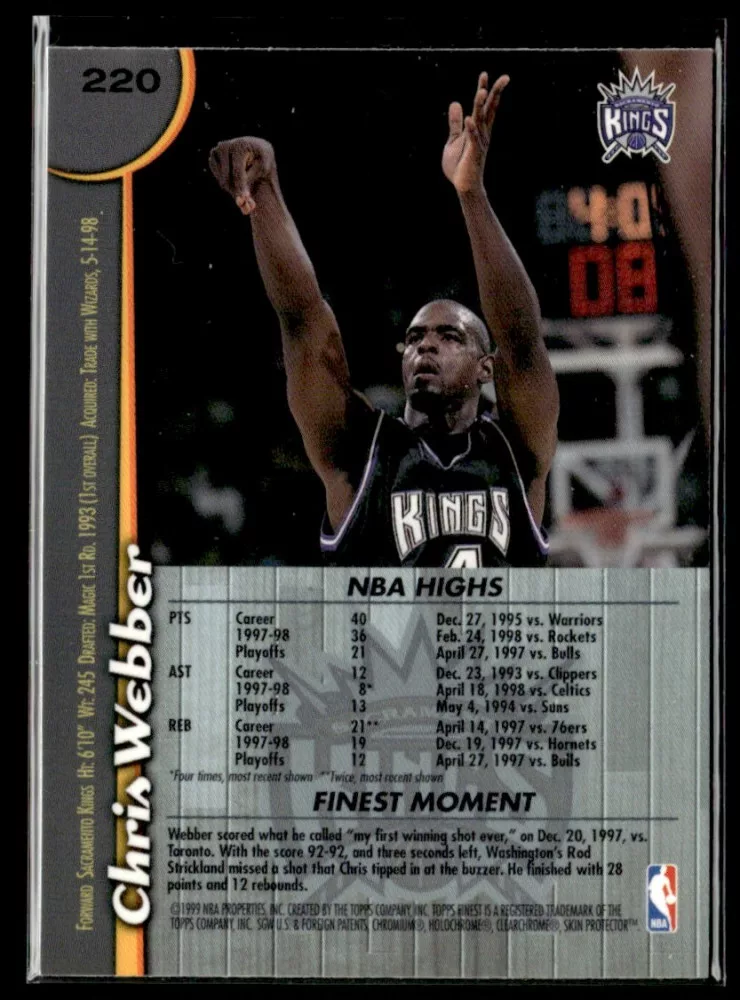 Az eladásra kínált 1998-99 Finest #220 Chris Webber kosaras kártya NM-MT állapotban van. A kosaras kártyákat legtöbb esetben UP Platinum/Standard puha védőtokban és/vagy UP Toploader (kemény védőtok)-ben küldjük.