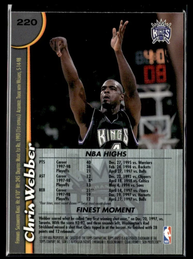 Az eladásra kínált 1998-99 Finest #220 Chris Webber kosaras kártya NM-MT állapotban van. A kosaras kártyákat legtöbb esetben UP Platinum/Standard puha védőtokban és/vagy UP Toploader (kemény védőtok)-ben küldjük.