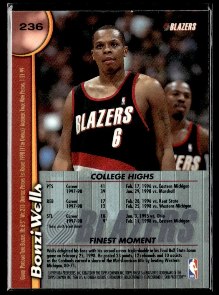Az eladásra kínált 1998-99 Finest #236 Bonzi Wells RC kosaras kártya NM-MT állapotban van. A kosaras kártyákat legtöbb esetben UP Platinum/Standard puha védőtokban és/vagy UP Toploader (kemény védőtok)-ben küldjük.