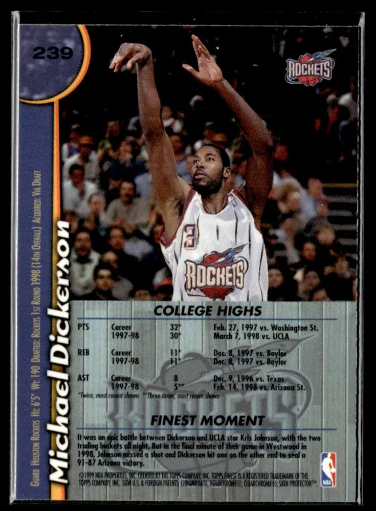 Az eladásra kínált 1998-99 Finest #239 Michael Dickerson RC kosaras kártya NM-MT állapotban van. A kosaras kártyákat legtöbb esetben UP Platinum/Standard puha védőtokban és/vagy UP Toploader (kemény védőtok)-ben küldjük.
