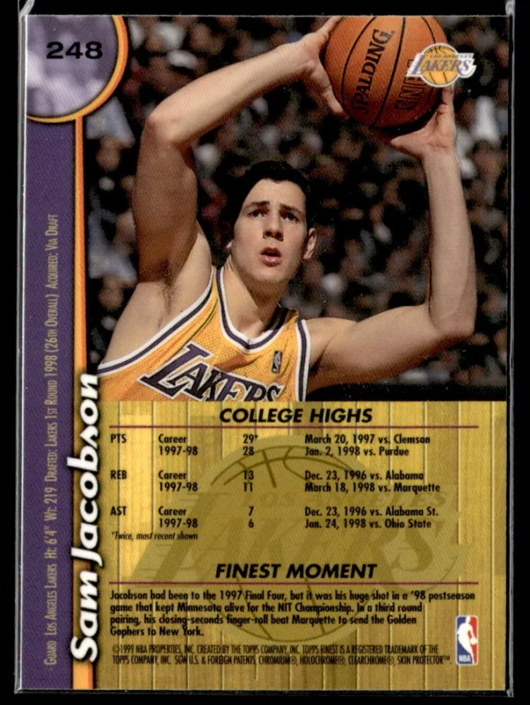 Az eladásra kínált 1998-99 Finest #248 Sam Jacobson RC kosaras kártya NM-MT állapotban van. A kosaras kártyákat legtöbb esetben UP Platinum/Standard puha védőtokban és/vagy UP Toploader (kemény védőtok)-ben küldjük.