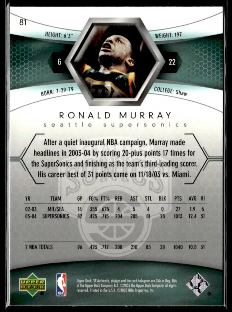 Az eladásra kínált 2005-06 SP Authentic #81 Ronald Murray kosaras kártya NM-MT állapotban van. A kosaras kártyákat legtöbb esetben UP Platinum/Standard puha védőtokban és/vagy UP Toploader (kemény védőtok)-ben küldjük.
