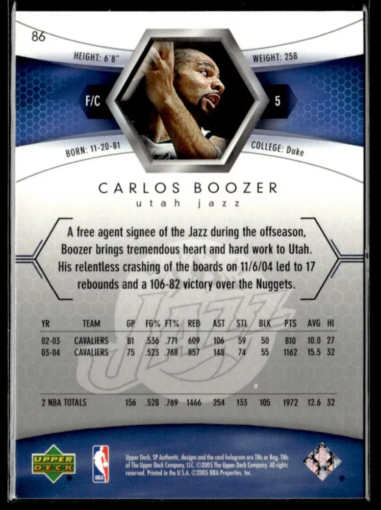 Az eladásra kínált 2005-06 SP Authentic #86 Carlos Boozer kosaras kártya NM-MT állapotban van. A kosaras kártyákat legtöbb esetben UP Platinum/Standard puha védőtokban és/vagy UP Toploader (kemény védőtok)-ben küldjük.