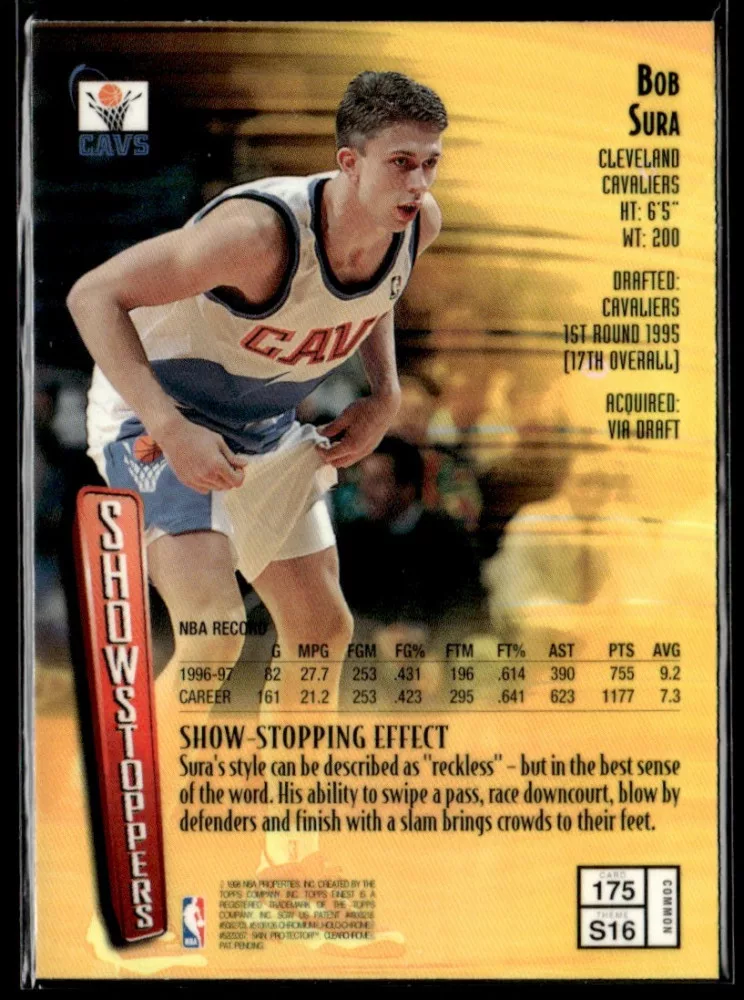 Az eladásra kínált 1997-98 Finest #175 Bob Sura kosaras kártya NM-MT állapotban van. A kosaras kártyákat legtöbb esetben UP Platinum/Standard puha védőtokban és/vagy UP Toploader (kemény védőtok)-ben küldjük.