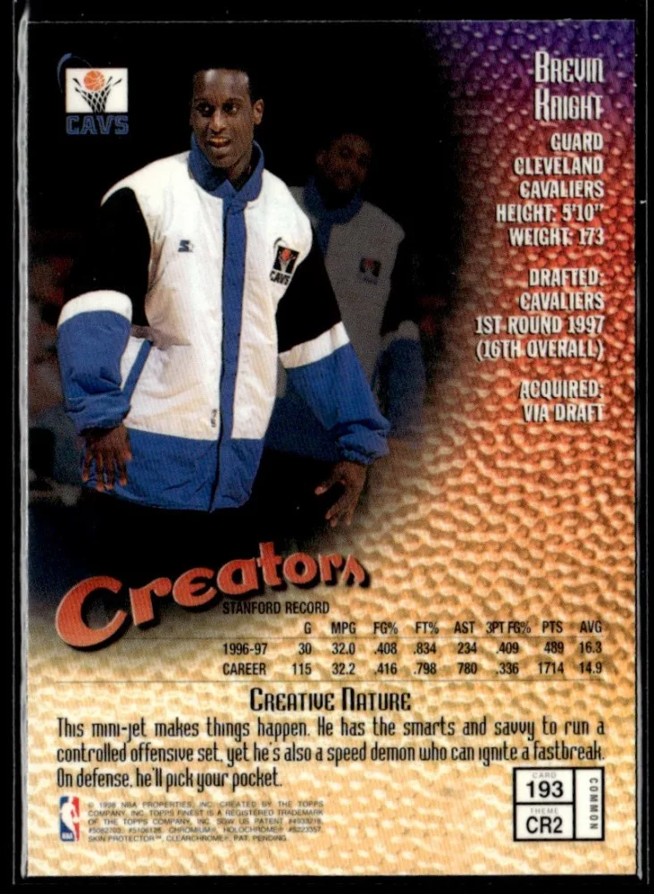 Az eladásra kínált 1997-98 Finest #193 Brevin Knight kosaras kártya NM-MT állapotban van. A kosaras kártyákat legtöbb esetben UP Platinum/Standard puha védőtokban és/vagy UP Toploader (kemény védőtok)-ben küldjük.