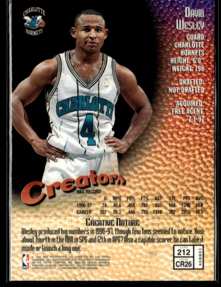 Az eladásra kínált 1997-98 Finest #212 David Wesley kosaras kártya NM-MT állapotban van. A kosaras kártyákat legtöbb esetben UP Platinum/Standard puha védőtokban és/vagy UP Toploader (kemény védőtok)-ben küldjük.