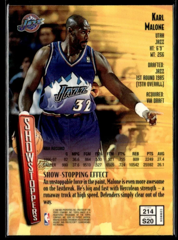 Az eladásra kínált 1997-98 Finest #214 Karl Malone kosaras kártya NM-MT állapotban van. A kosaras kártyákat legtöbb esetben UP Platinum/Standard puha védőtokban és/vagy UP Toploader (kemény védőtok)-ben küldjük.