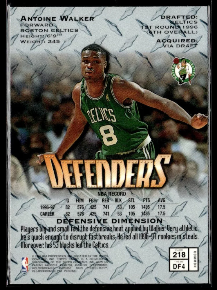 Az eladásra kínált 1997-98 Finest #218 Antoine Walker kosaras kártya NM-MT állapotban van. A kosaras kártyákat legtöbb esetben UP Platinum/Standard puha védőtokban és/vagy UP Toploader (kemény védőtok)-ben küldjük.