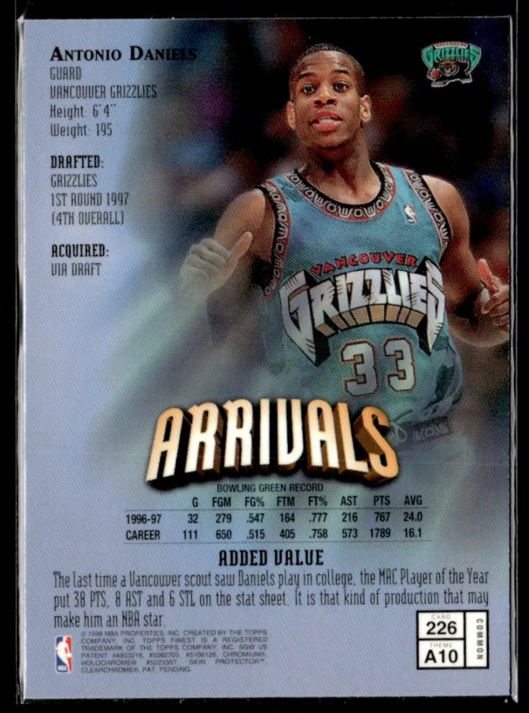 Az eladásra kínált 1997-98 Finest #226 Antonio Daniels kosaras kártya NM-MT állapotban van. A kosaras kártyákat legtöbb esetben UP Platinum/Standard puha védőtokban és/vagy UP Toploader (kemény védőtok)-ben küldjük.