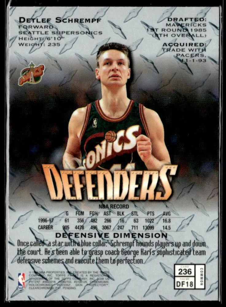 Az eladásra kínált 1997-98 Finest #236 Detlef Schrempf kosaras kártya NM-MT állapotban van. A kosaras kártyákat legtöbb esetben UP Platinum/Standard puha védőtokban és/vagy UP Toploader (kemény védőtok)-ben küldjük.