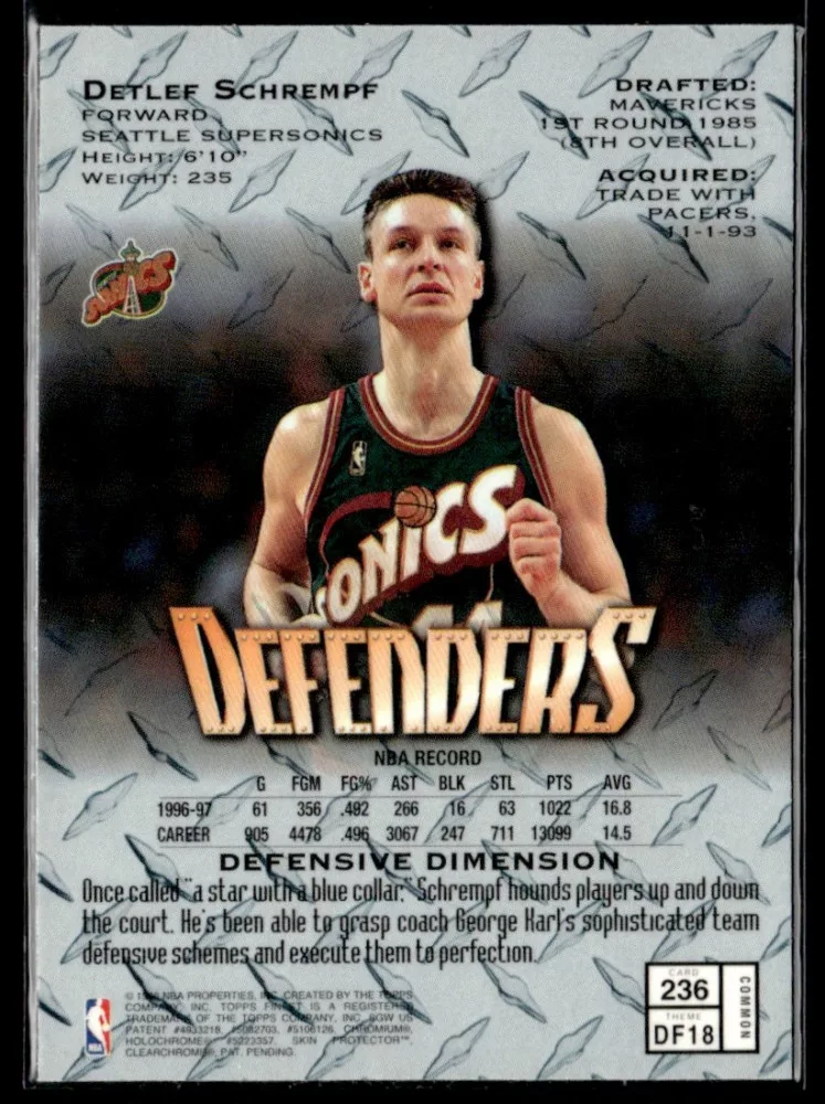 Az eladásra kínált 1997-98 Finest #236 Detlef Schrempf kosaras kártya NM-MT állapotban van. A kosaras kártyákat legtöbb esetben UP Platinum/Standard puha védőtokban és/vagy UP Toploader (kemény védőtok)-ben küldjük.