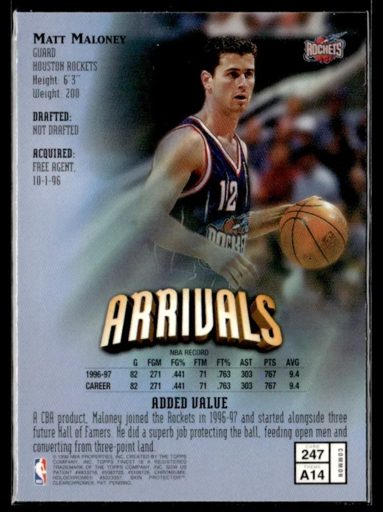 Az eladásra kínált 1997-98 Finest #247 Matt Maloney kosaras kártya NM-MT állapotban van. A kosaras kártyákat legtöbb esetben UP Platinum/Standard puha védőtokban és/vagy UP Toploader (kemény védőtok)-ben küldjük.