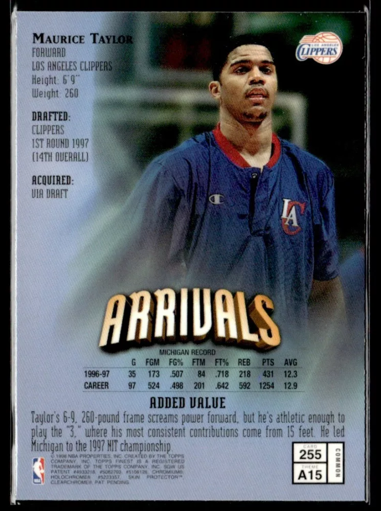 Az eladásra kínált 1997-98 Finest #255 Maurice Taylor kosaras kártya NM-MT állapotban van. A kosaras kártyákat legtöbb esetben UP Platinum/Standard puha védőtokban és/vagy UP Toploader (kemény védőtok)-ben küldjük.