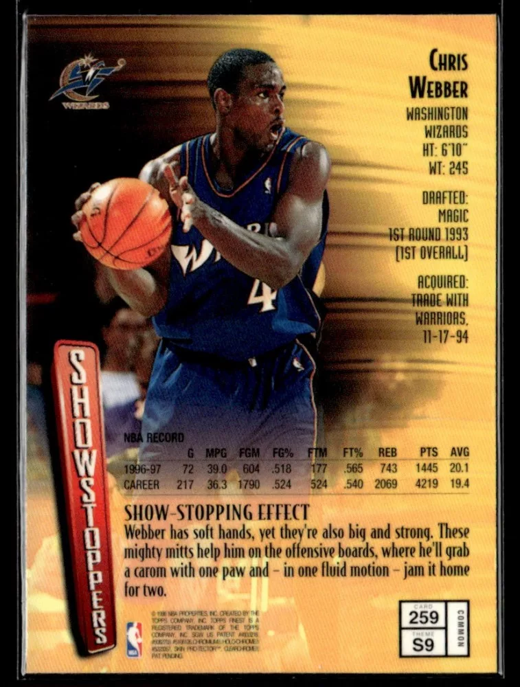 Az eladásra kínált 1997-98 Finest #259 Chris Webber kosaras kártya NM-MT állapotban van. A kosaras kártyákat legtöbb esetben UP Platinum/Standard puha védőtokban és/vagy UP Toploader (kemény védőtok)-ben küldjük.