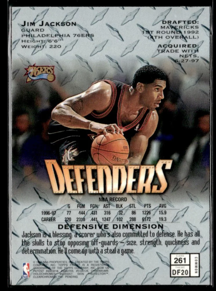 Az eladásra kínált 1997-98 Finest #261 Jim Jackson kosaras kártya NM-MT állapotban van. A kosaras kártyákat legtöbb esetben UP Platinum/Standard puha védőtokban és/vagy UP Toploader (kemény védőtok)-ben küldjük.