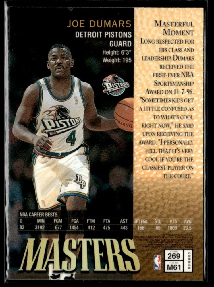 Az eladásra kínált 1997-98 Finest #269 Joe Dumars kosaras kártya NM-MT állapotban van. A kosaras kártyákat legtöbb esetben UP Platinum/Standard puha védőtokban és/vagy UP Toploader (kemény védőtok)-ben küldjük.