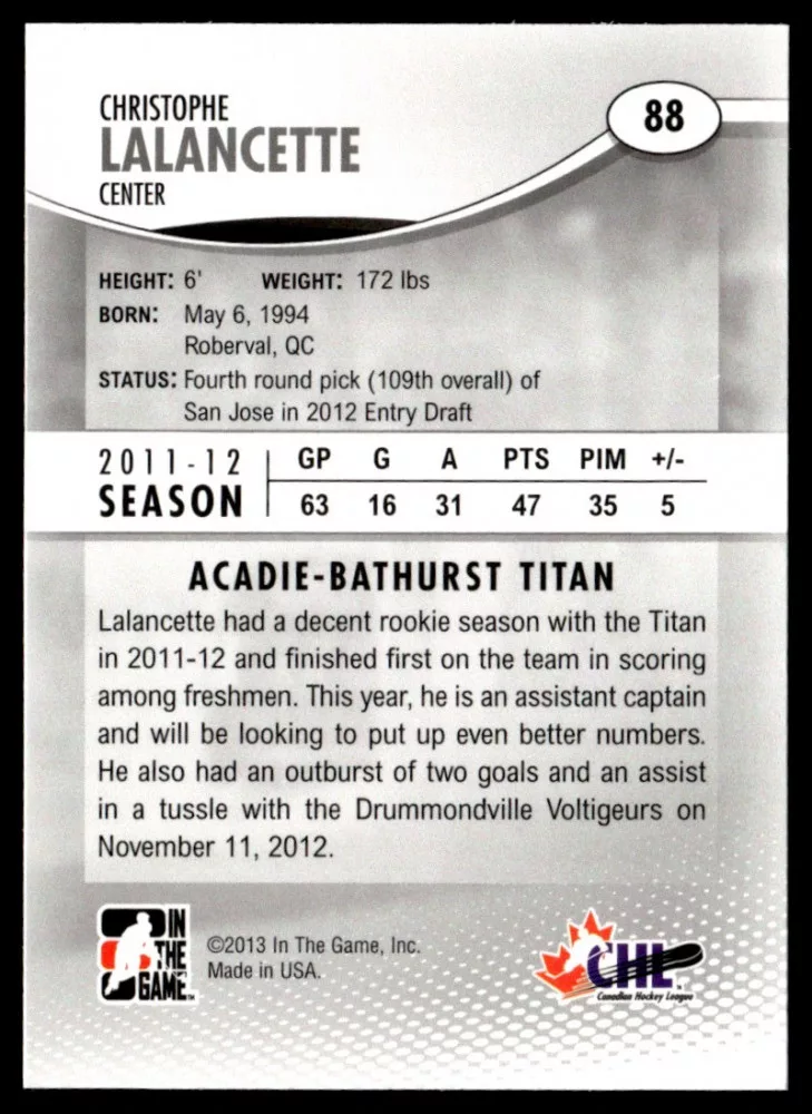2012 In The Game Heroes and Prospects #88 Christophe Lalancette