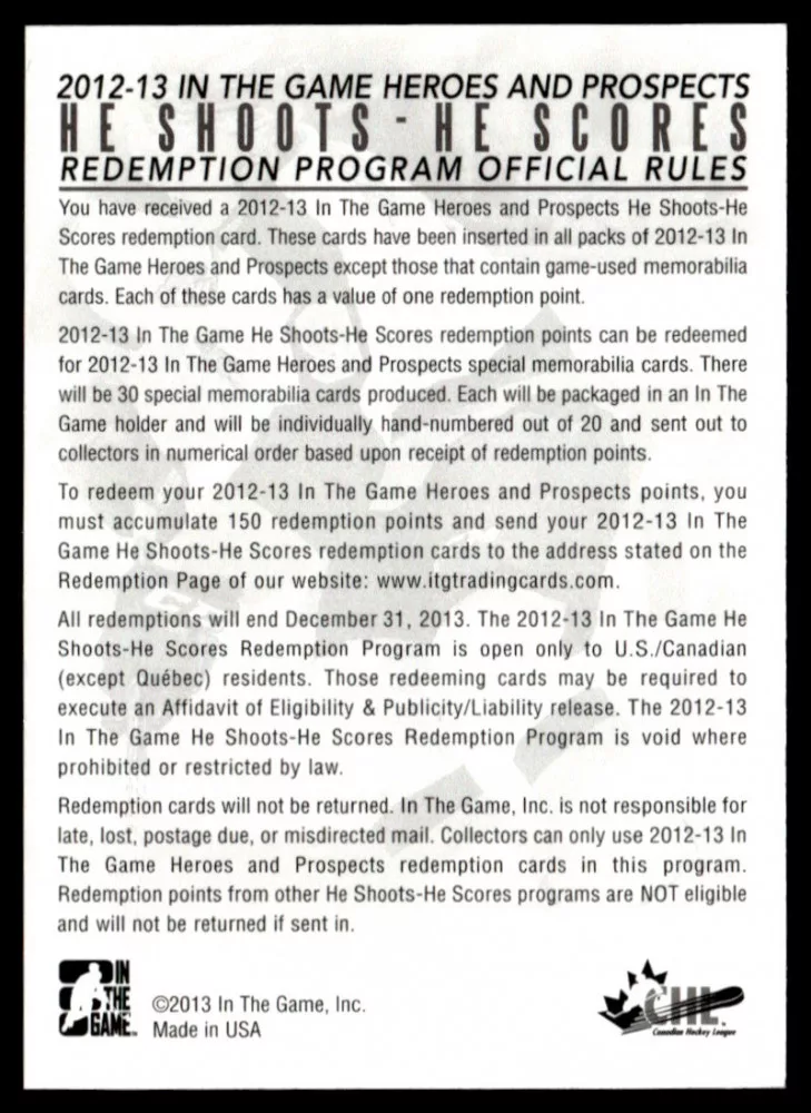 2012 In The Game Heroes and Prospects He Shoots He Scores Points #11 Bobby Bauer